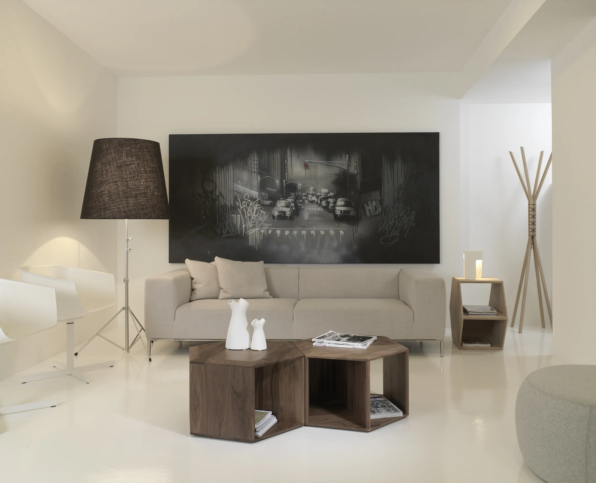 Made in solid wood, Hexa can be placed in both horizontal and vertical positions, working as a simple coffee table or as a side or bedside table. Its modular design allows it to fit into different spaces.