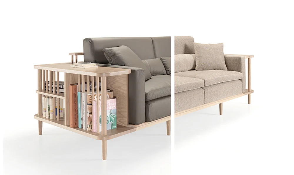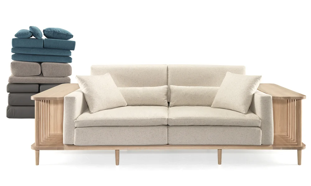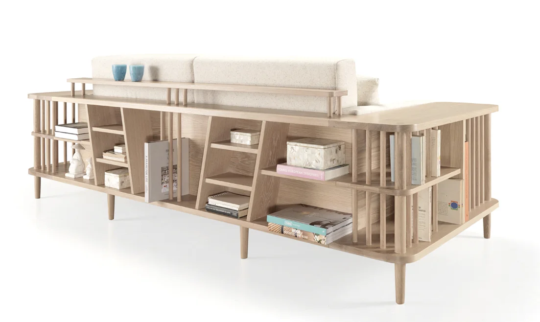 The Portuguese specialist in solid wood furniture Wewood presents a sofa designed by André Teoman Studio that doubles as a bookshelf. Combining noble materials, traditional joinery, handcraft and advanced technology, its Scandinavian-style surrounding wooden frame with strong, minimalist lines allows users to work, play, store or display items.